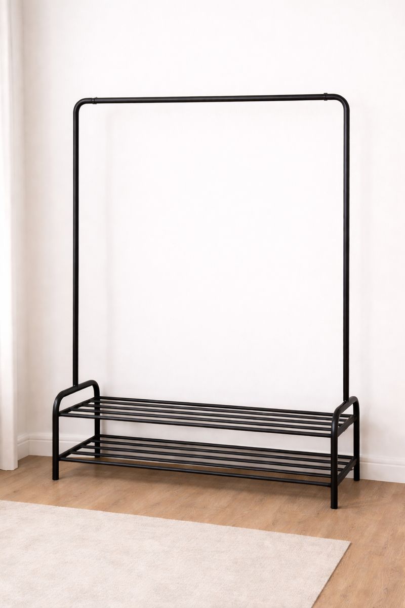 Upgrade your storage with this sleek and minimalist metal clothes drying rack, designed to keep your space organized and stylish. Crafted from durable black metal, this clothes drying rack rack features a sturdy hanging bar for coats, shirts, dresses, and more, along with two spacious lower shelves ideal for shoes, storage boxes, or accessories.