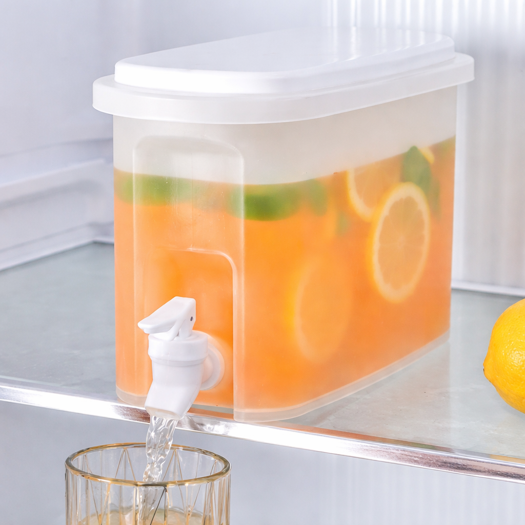 This practical fridge water dispenser box is perfect for storing and serving juices, water, and cold drinks. Made from durable food-grade plastic, it features a convenient tap for easy pouring without lifting. Its compact rectangular design fits neatly inside your refrigerator, saving space while keeping beverages fresh. Ideal for home, kitchen, and summer use in Pakistan.