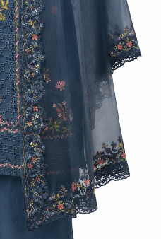 Navy blue 3 piece embroidered lawn suit with floral embroidery, chiffon dupatta & trousers. Stylish, breathable & perfect for summer wear.Navy-tunic-with-floral-embroidery