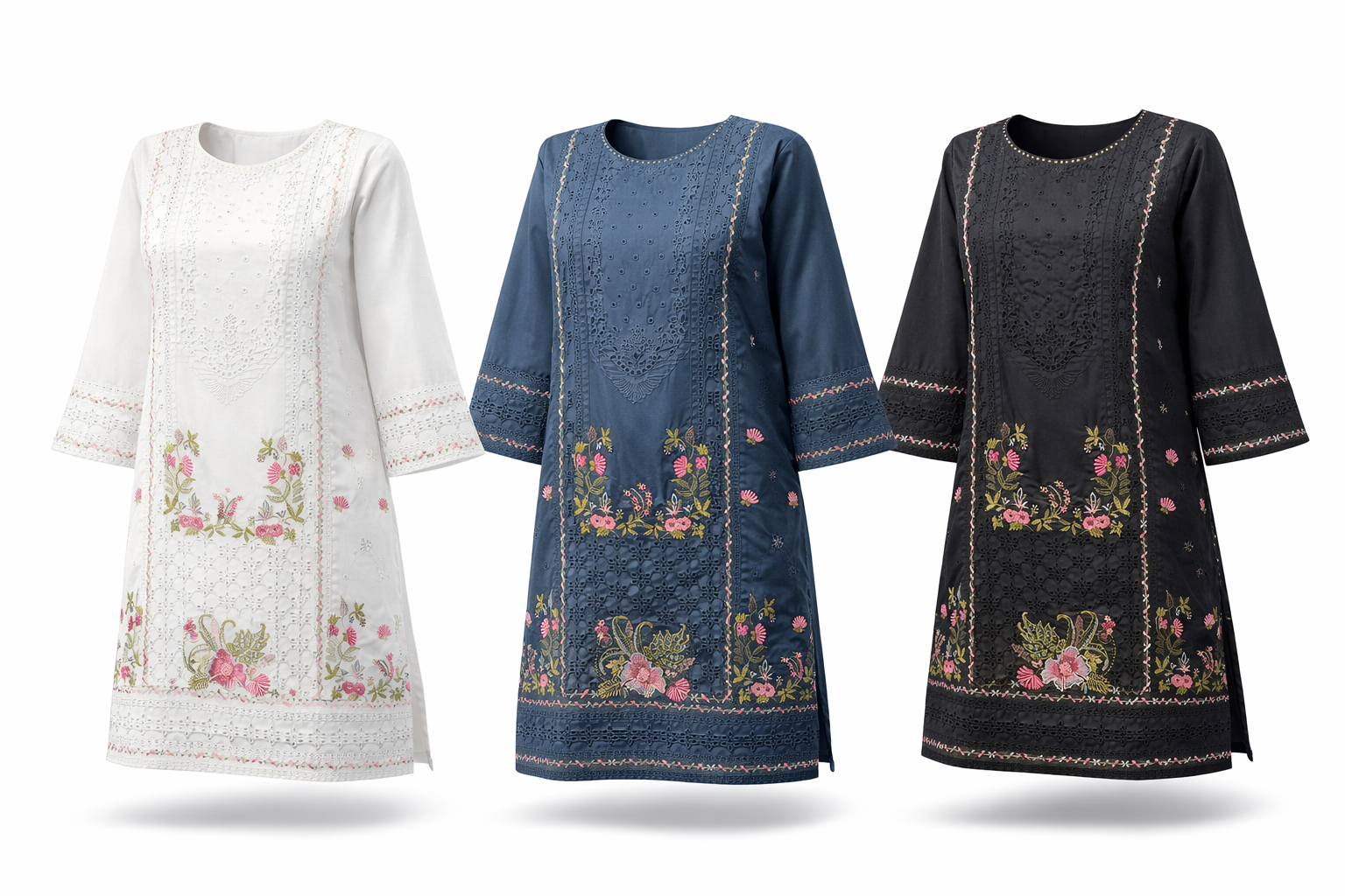 • Embroidery placed across the front panel, sleeves, and hemline for a balanced, elegant look
