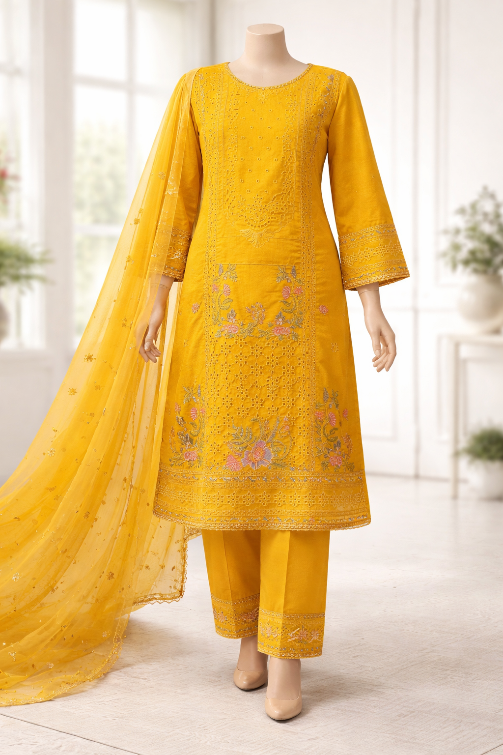 Elevate your wardrobe with this stunning 3-piece embroidered lawn suit, available in yellow, navy blue, and black, perfect for women who love style, comfort, and timeless elegance. Crafted from premium-quality breathable lawn fabric, this suit keeps you cool in warm weather while offering a luxurious and sophisticated look for festive occasions, family gatherings, formal lunches, or casual events.